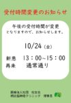 • 10/24(金)午後の初診患者さんの受付時間は15:00までとなります。再来につきましては通常通りとなっております。 ご迷惑をお掛け致しますが、よろしくお願い致します。