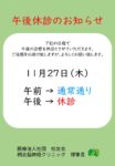 • 11月27日(木)は午後の診察を休診とさせていただきます。ご迷惑をお掛け致しますが、よろしくお願い致します。