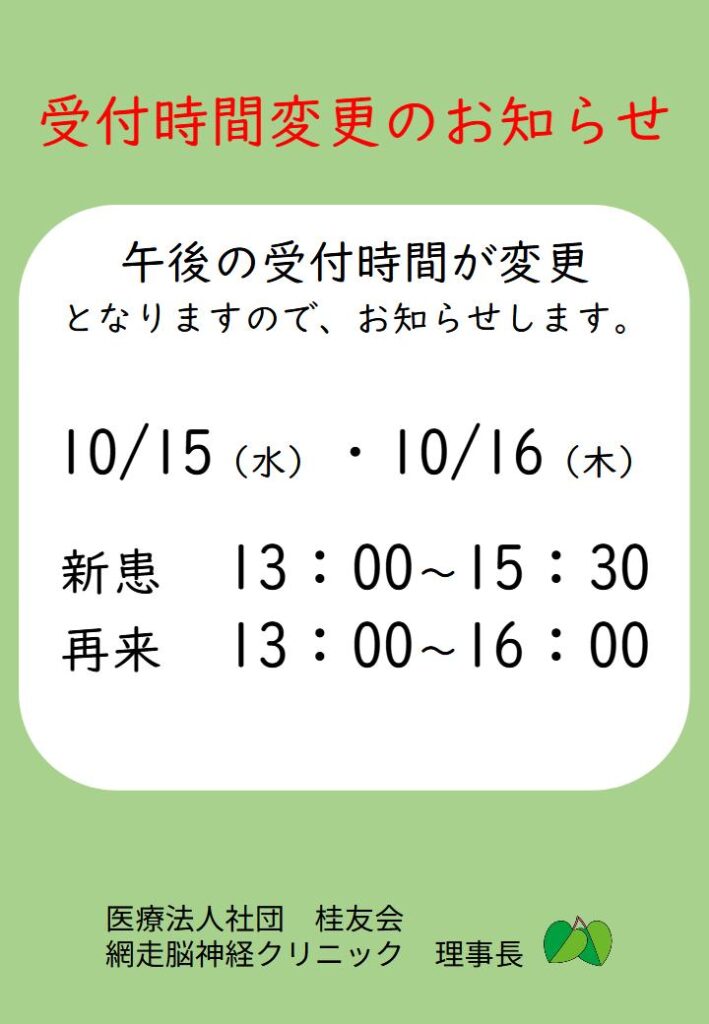 10月15日(水)、10月16日(木)の受付時間が変更となりますので、お知らせ致します。