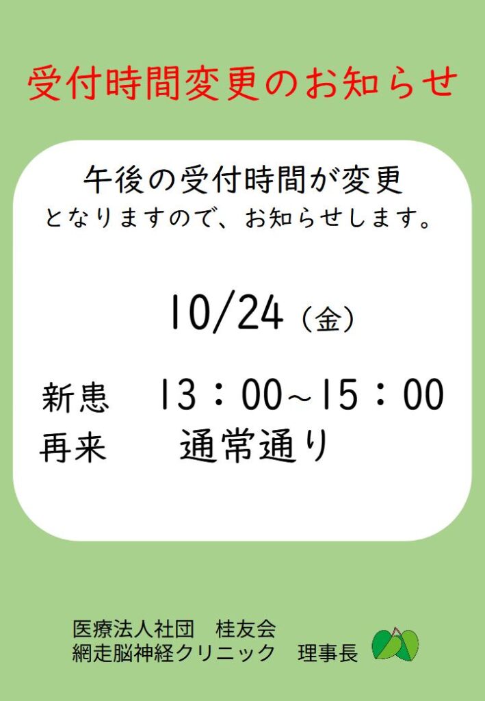 10/24(金)午後の受付時間変更のお知らせ 2025/10/21 10/24(金)午後の初診患者さんの受付時間は15:00までとなります。再来につきましては通常通りとなっております。 ご迷惑をお掛け致しますが、よろしくお願い致します。